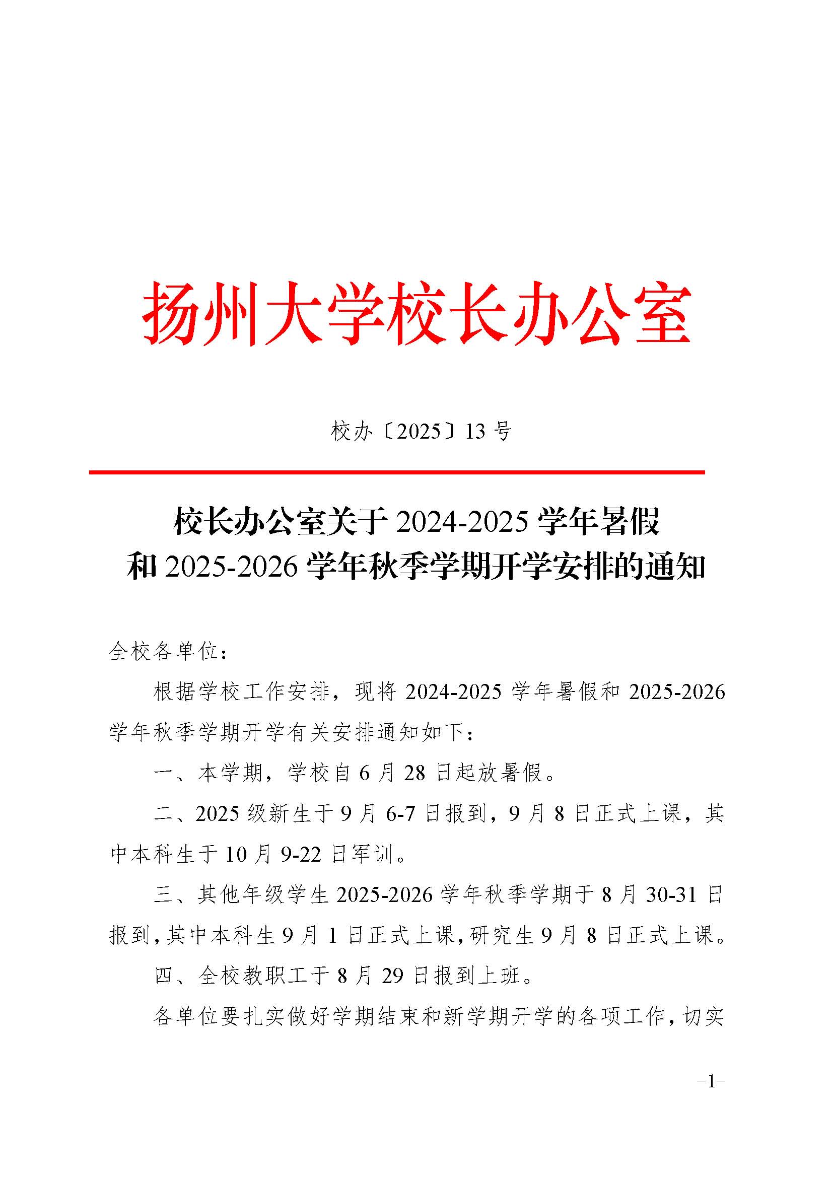 校长办公室关于2024-2025学年暑假和2025-2026学年秋季学期开学安排的通知