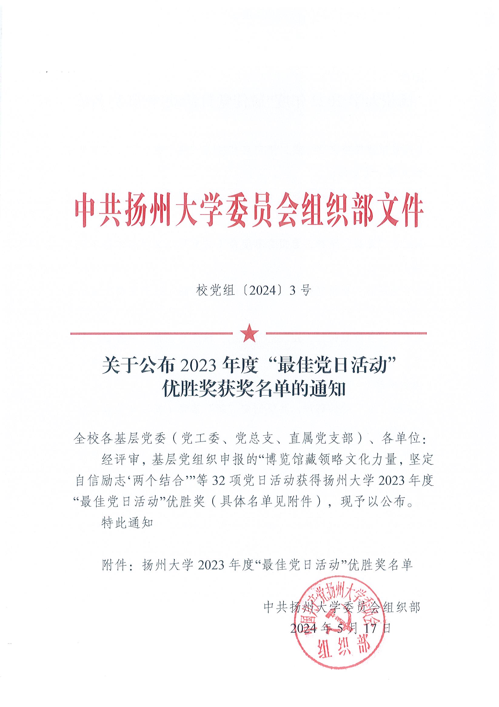 校办党支部荣获2023年度“最佳党日活动”优胜奖