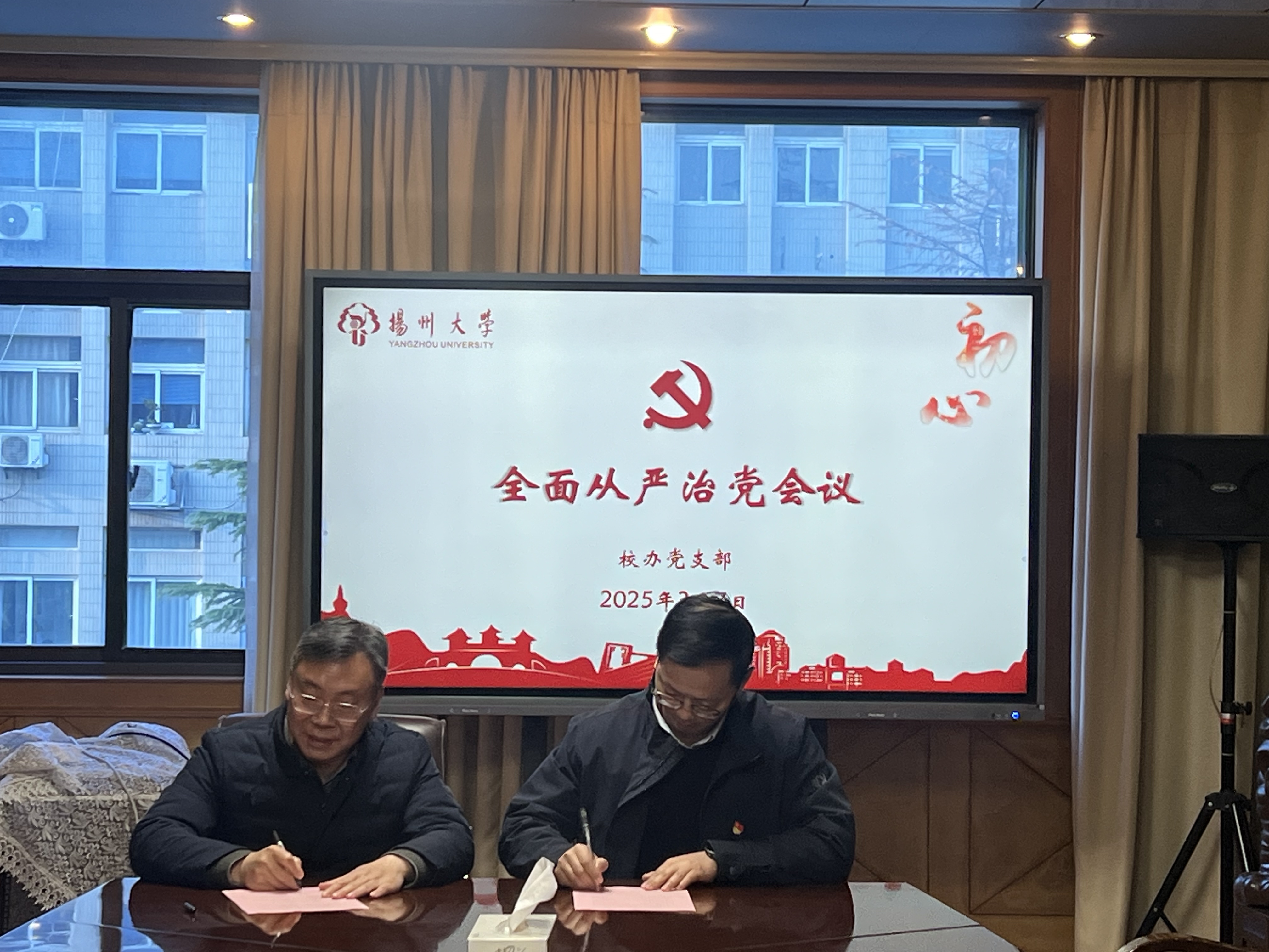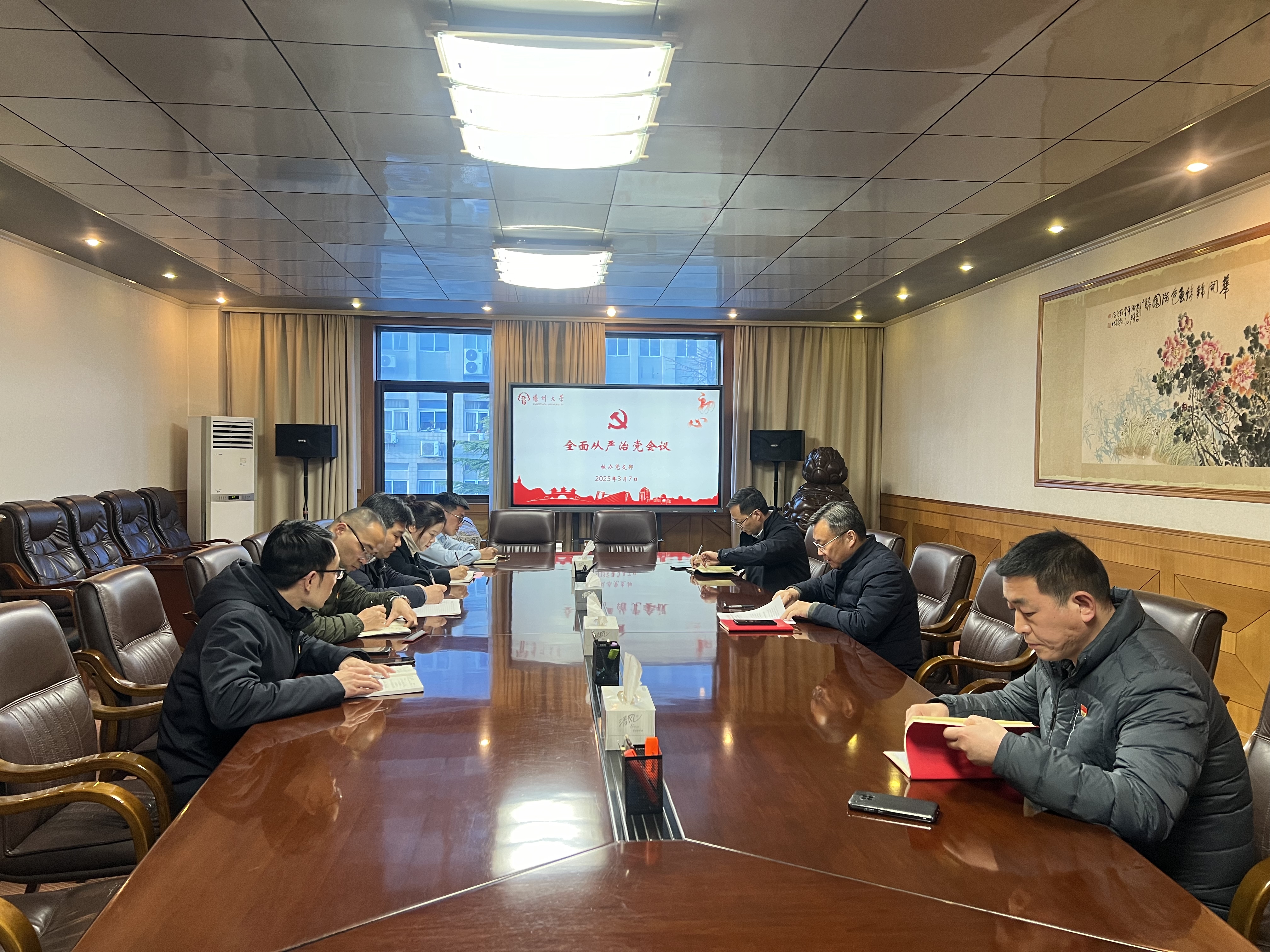 3月7日下午,校办党支部在行政楼218会议室召开2025年全面从严治党工作会议。支部书记、校办主任龚俊杰同志主持会议。