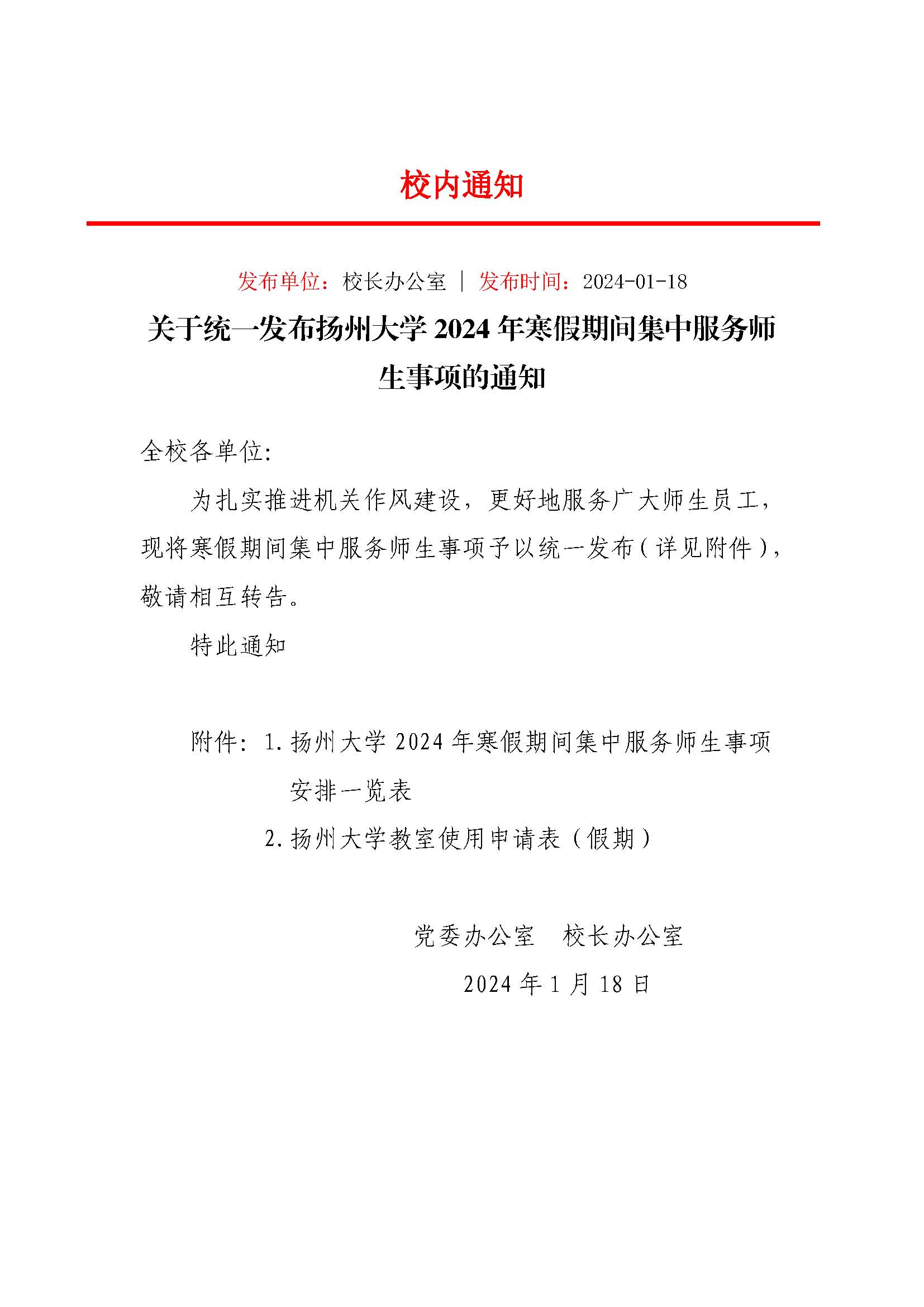 关于统一发布扬州大学2024年寒假期间集中服务师生事项的通知