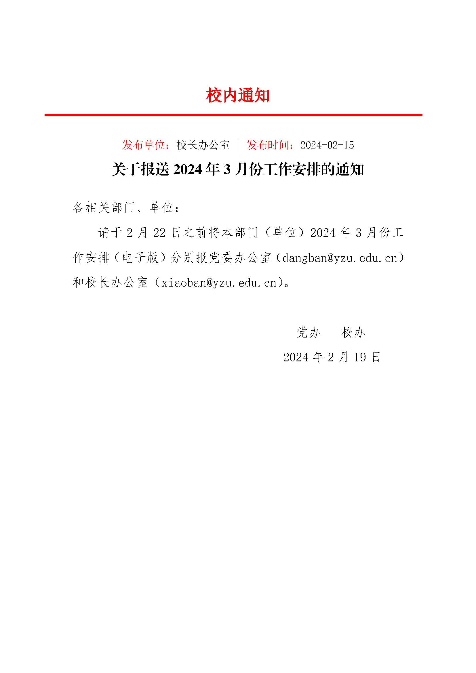关于报送2024年3月份工作安排的通知