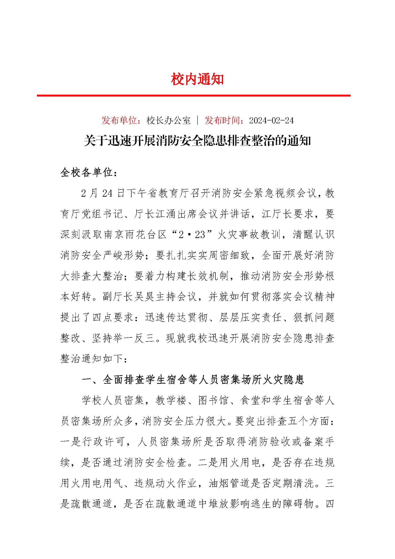 关于迅速开展消防安全隐患排查整治的通知