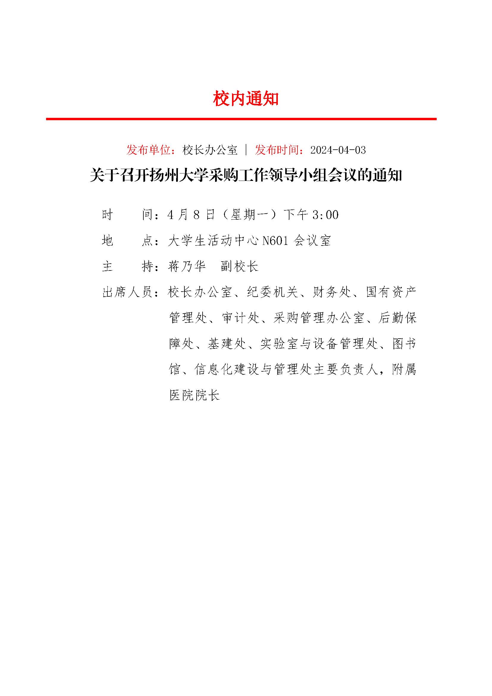 关于召开扬州大学采购工作领导小组会议的通知