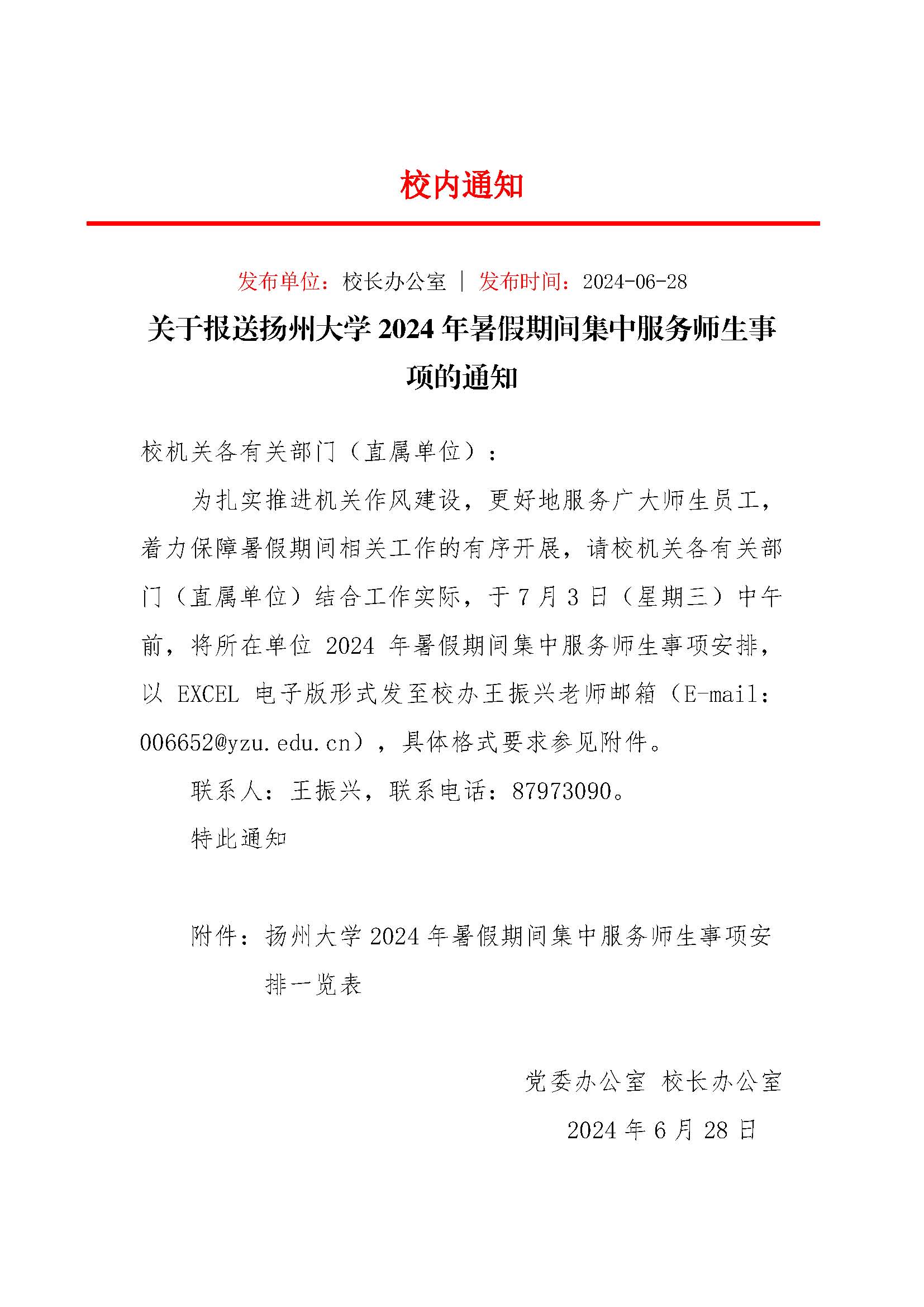 关于报送扬州大学2024年暑假期间集中服务师生事项的通知