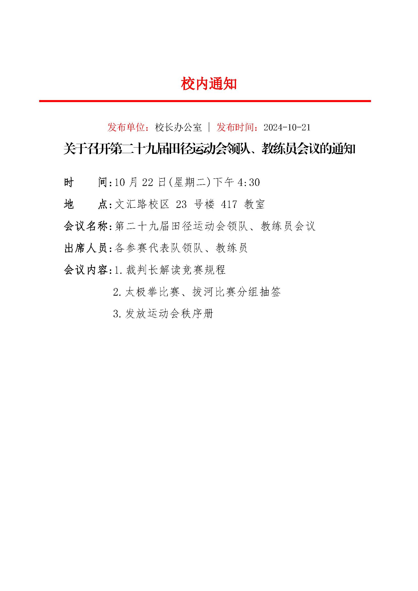 关于召开第二十九届田径运动会领队、教练员会议的通知