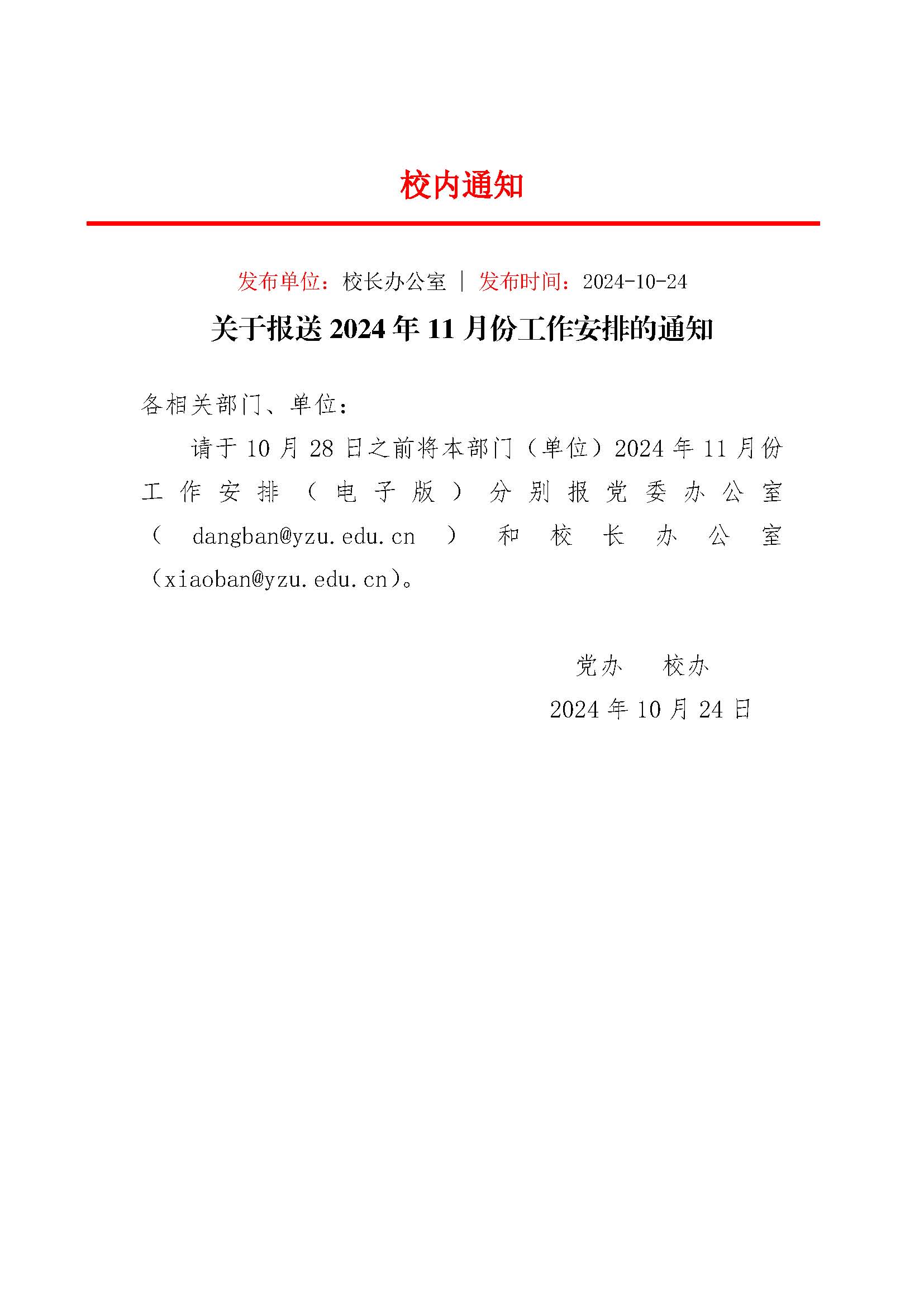 关于报送2024年11月份工作安排的通知