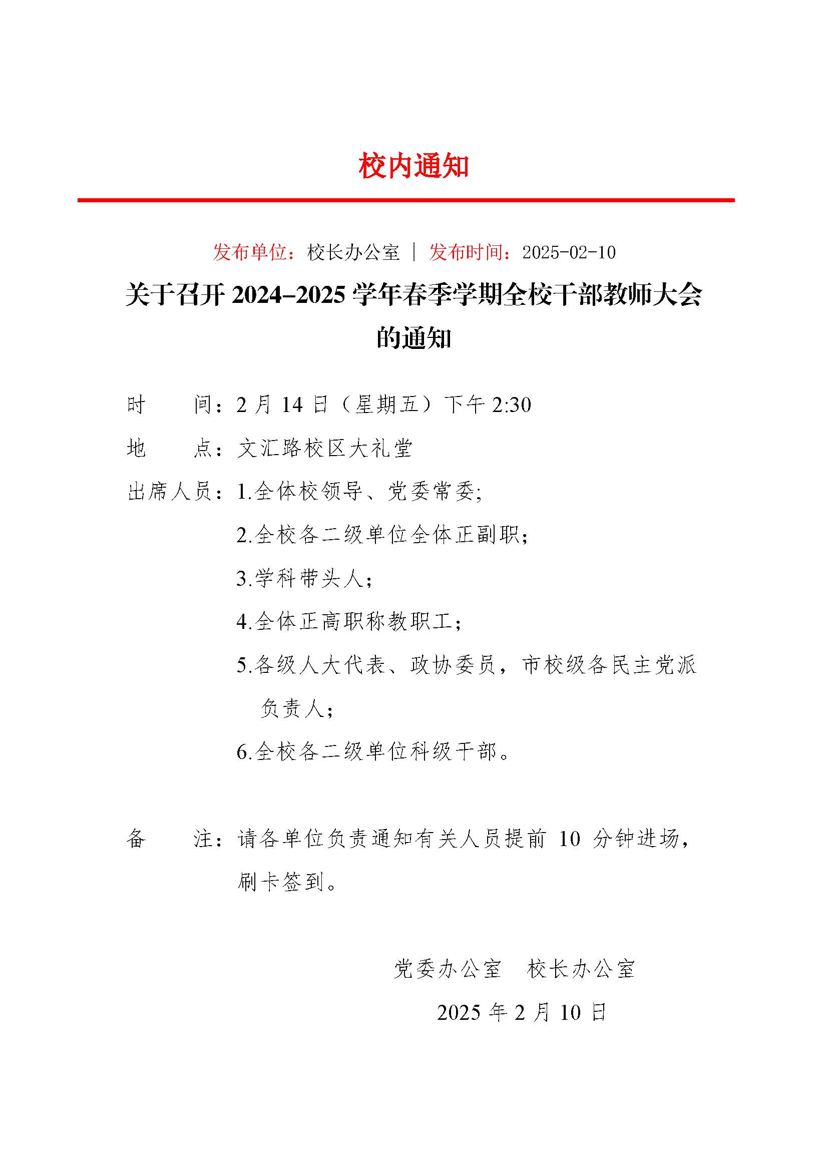 关于召开2024-2025学年春季学期全校干部教师大会的通知