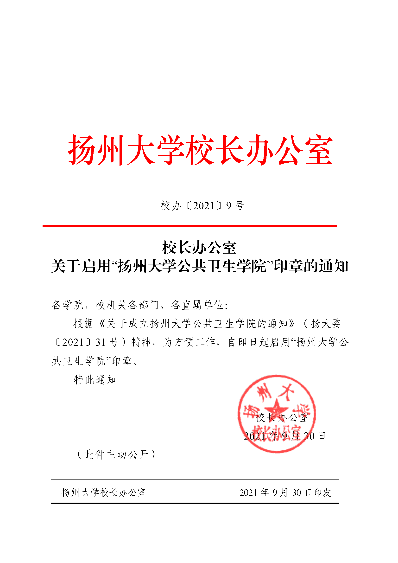 校长办公室关于启用“扬州大学公共卫生学院”印章的通知