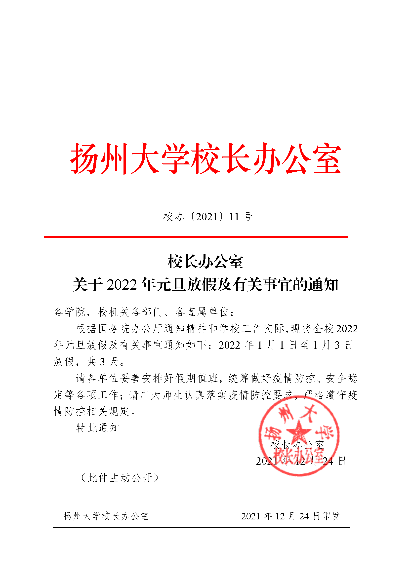 校长办公室关于2022年元旦放假及有关事宜的通知
