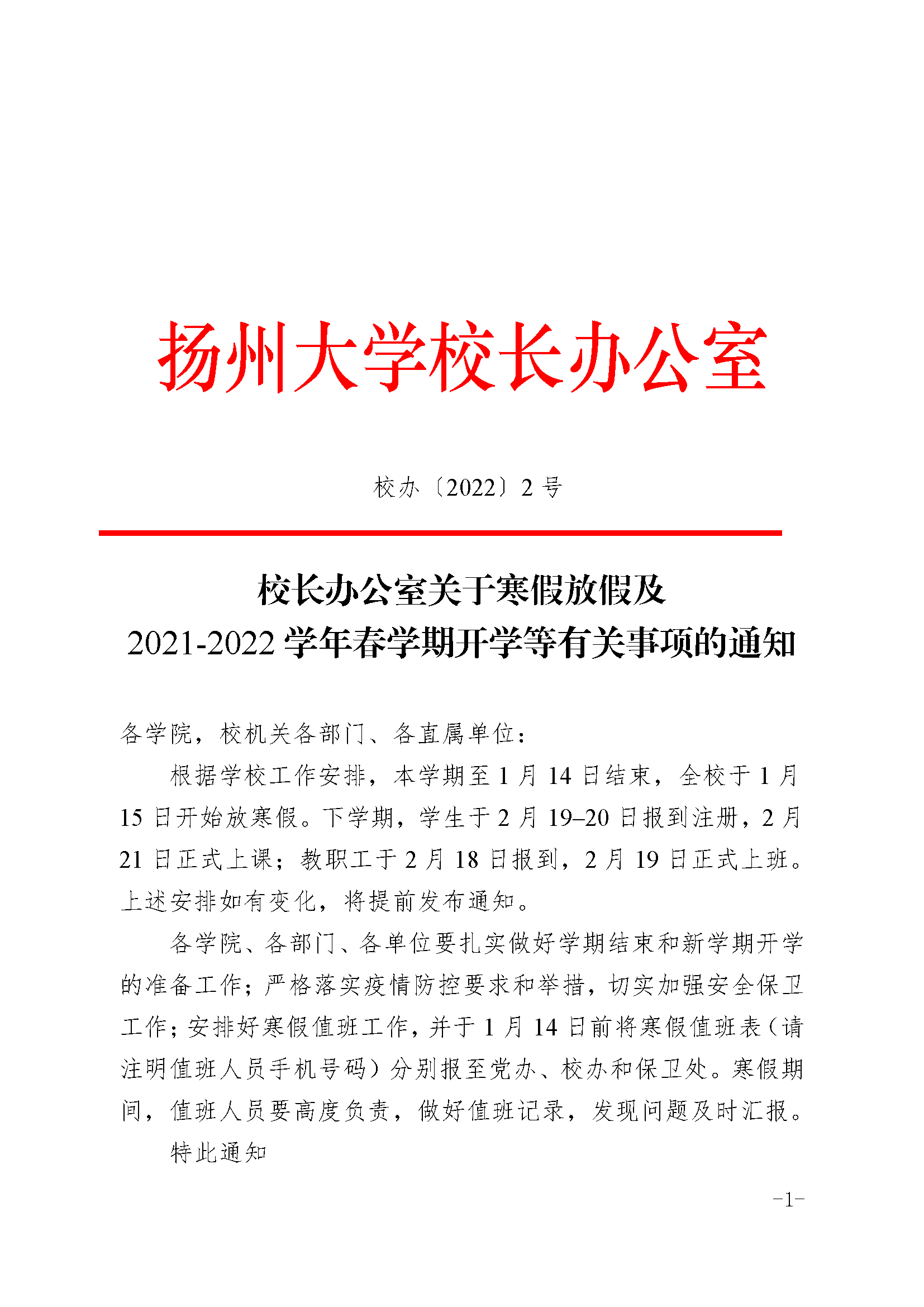 校长办公室关于寒假放假及2021-2022学年春学期开学等有关事项的通知