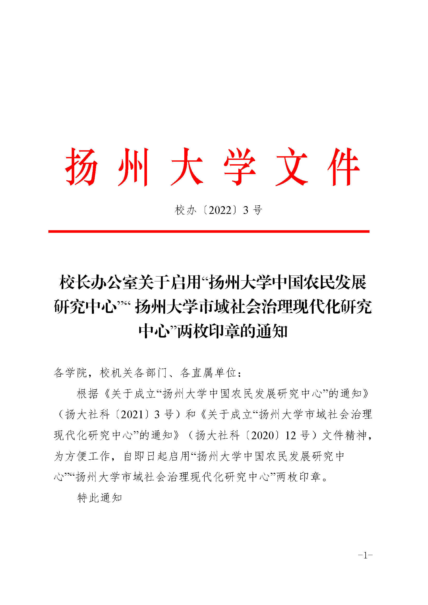 校长办公室关于启用“扬州大学中国农民发展研究中心”“ 扬州大学市域社会治理现代化研究中心” 两枚印章的通知