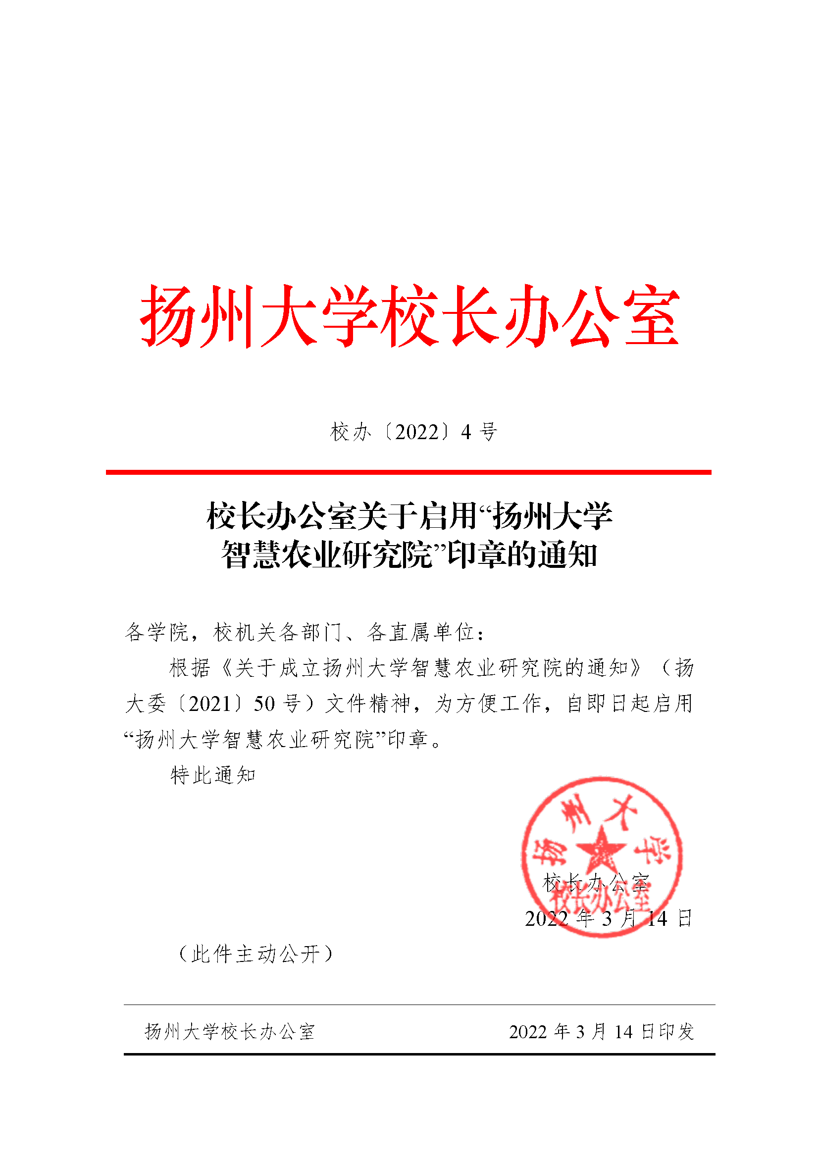 校长办公室关于启用“扬州大学智慧农业研究院”印章的通知
