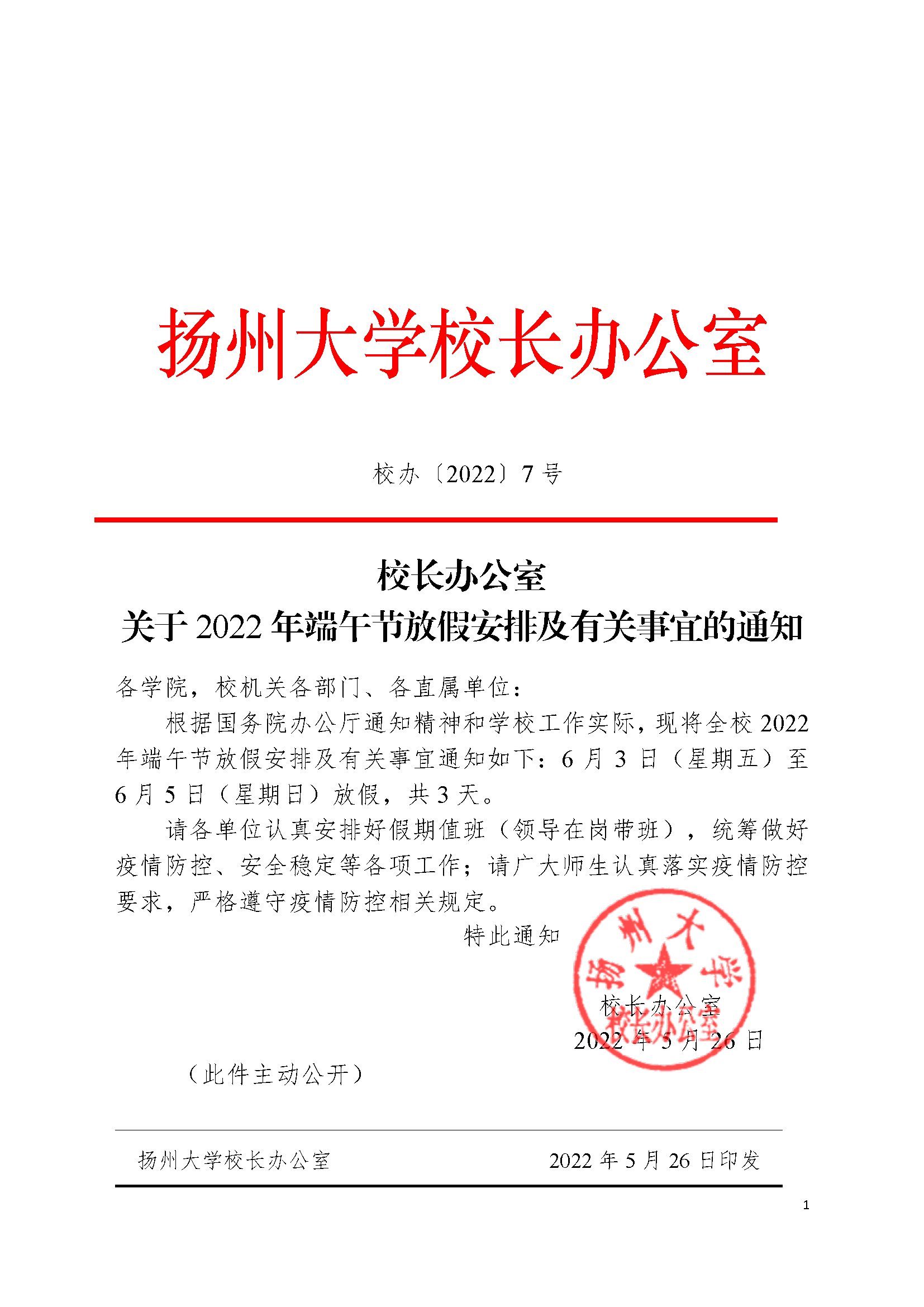 校长办公室关于2022年端午节放假安排及有关事宜的通知