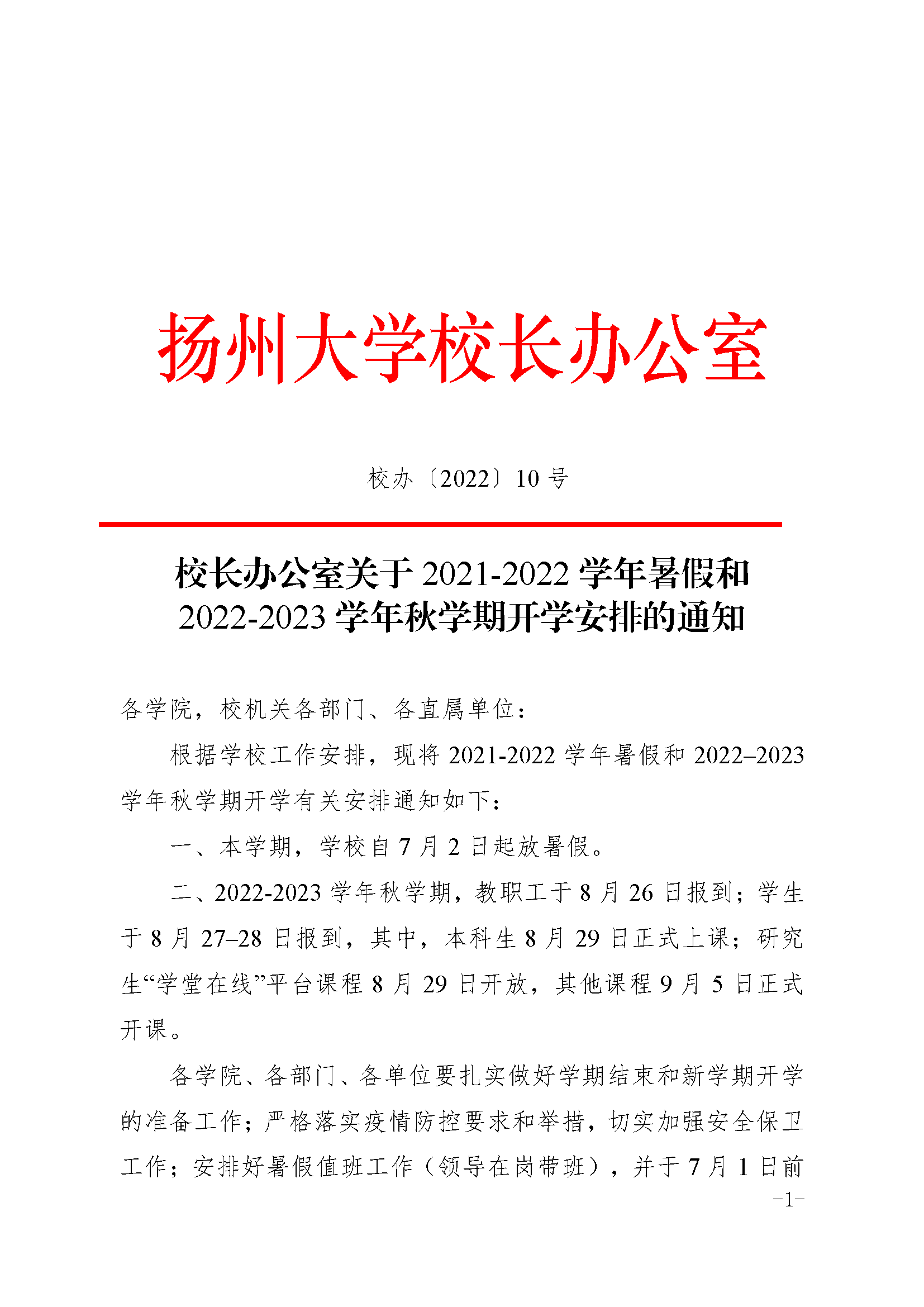 校长办公室关于2021-2022学年暑假和2022-2023学年秋学期开学安排的通知_