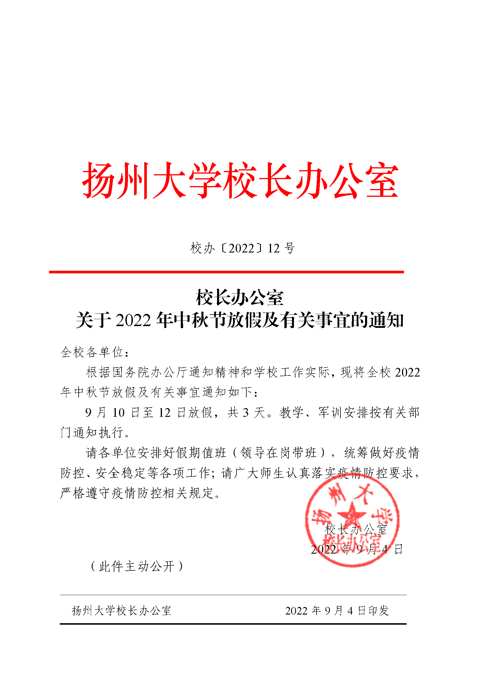 校长办公室关于2022年中秋节放假及有关事宜的通知