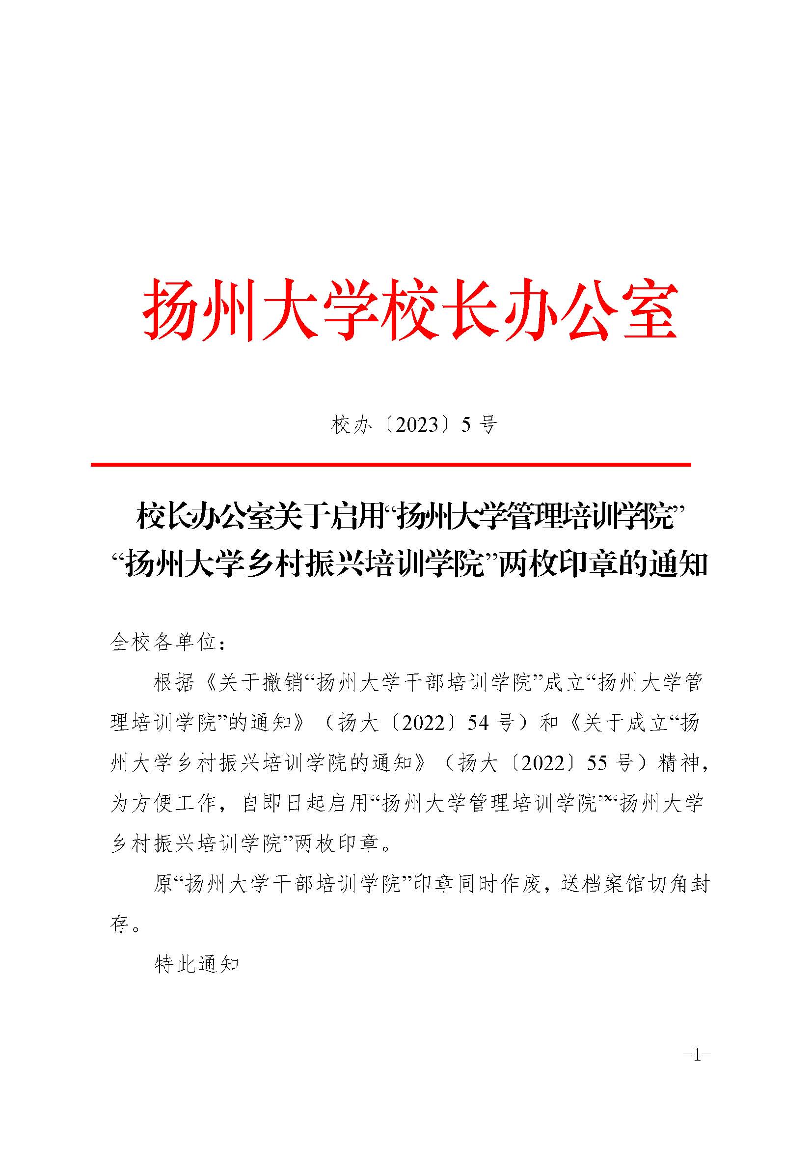 校长办公室关于启用“扬州大学管理培训学院”“扬州大学乡村振兴培训学院”两枚印章的通知