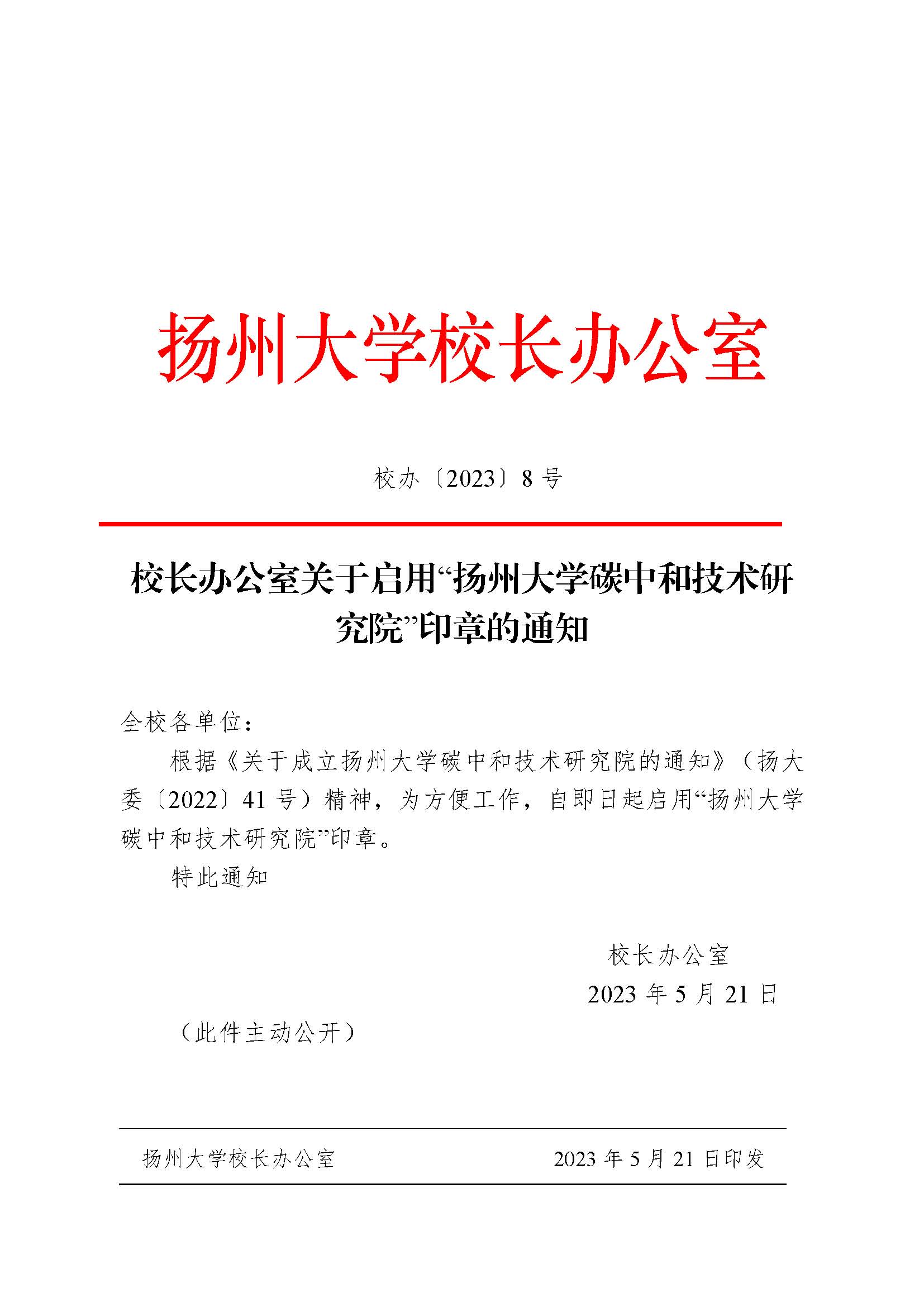 校长办公室关于启用“扬州大学碳中和技术研究院”印章的通知