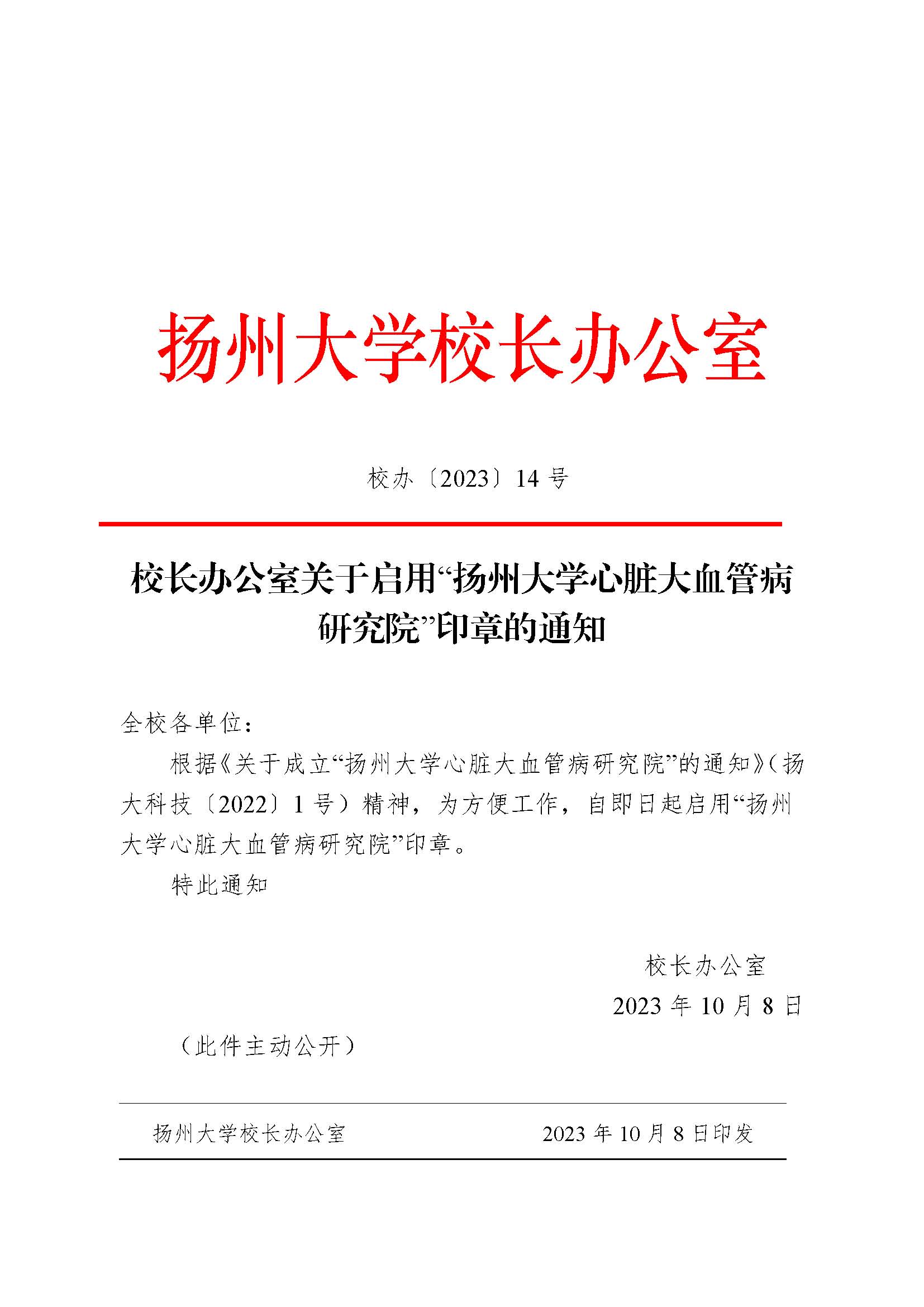 校长办公室关于启用“扬州大学心脏大血管病研究院”印章的通知