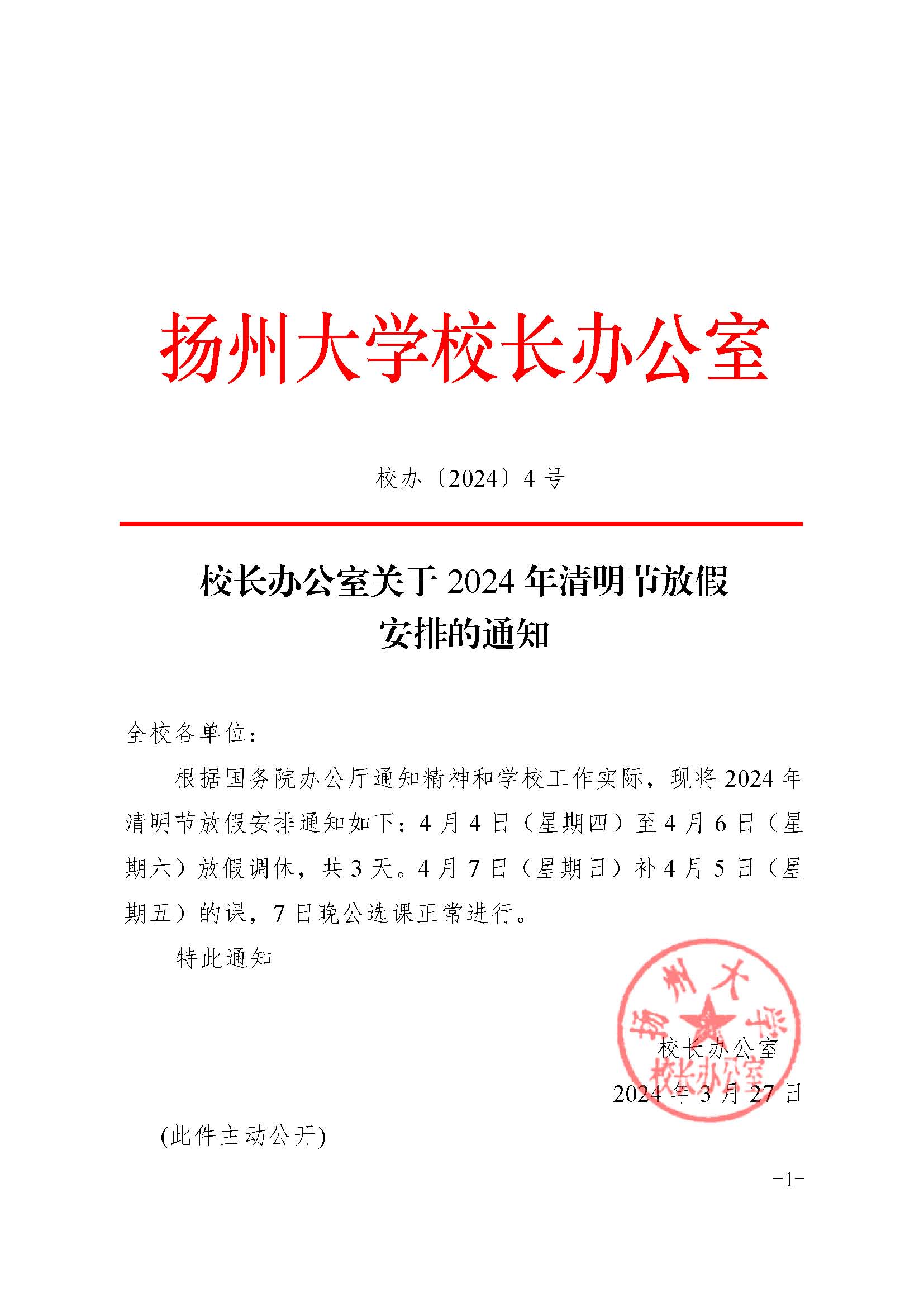 校长办公室关于2024年清明节放假安排的通知