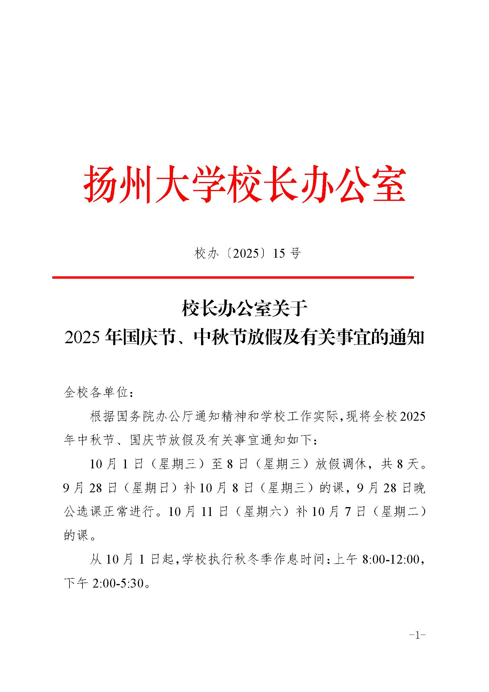 校长办公室关于2025年国庆节、中秋节放假及有关事宜的通知