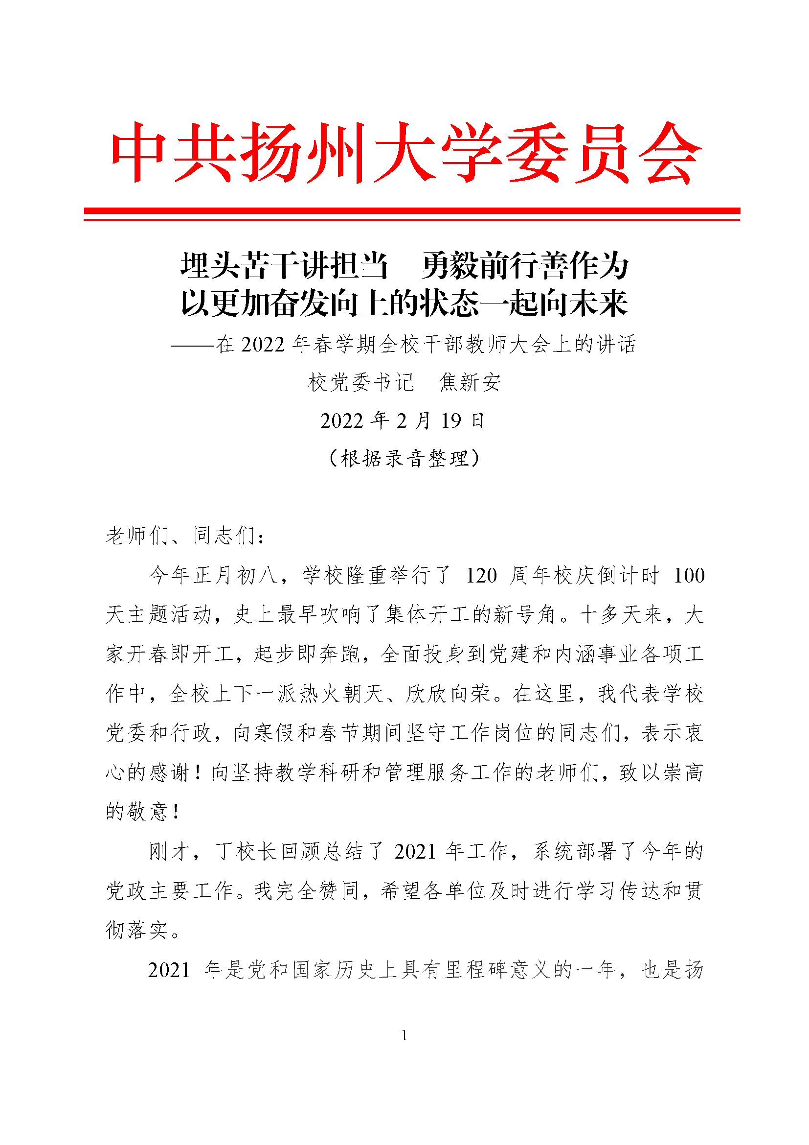 焦新安书记在2022年春学期全校干部教师大会上的讲话