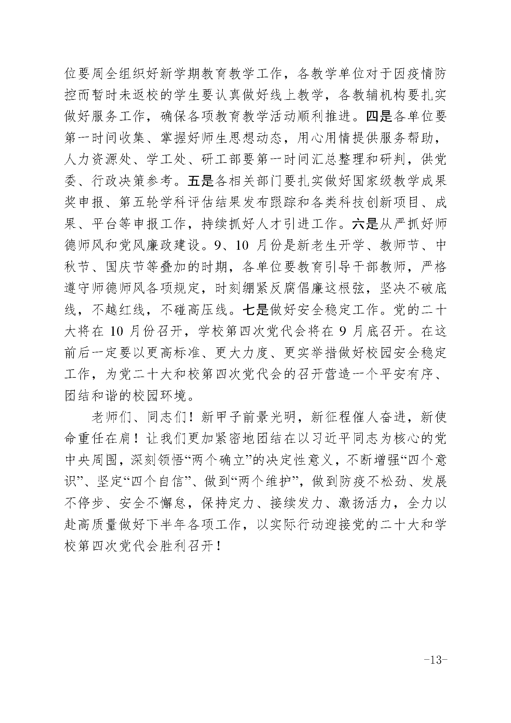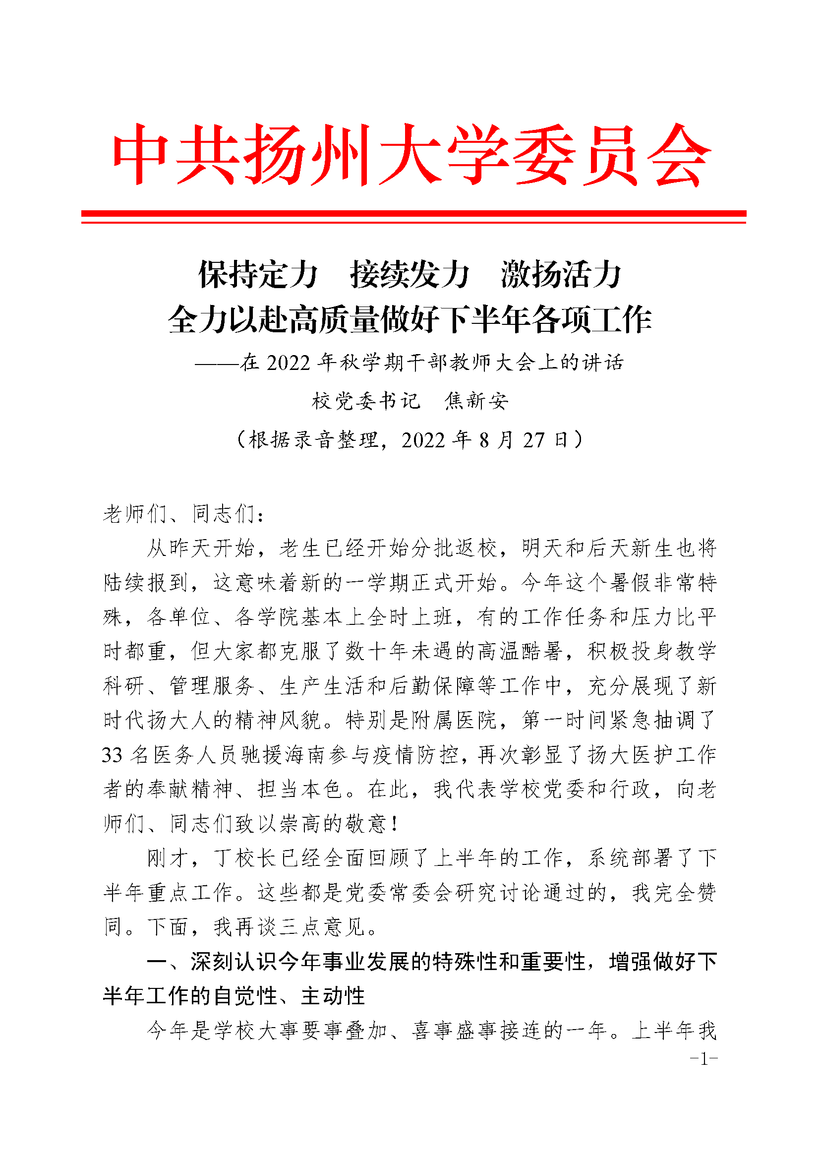 焦新安书记在2022年秋学期干部教师大会上的讲话