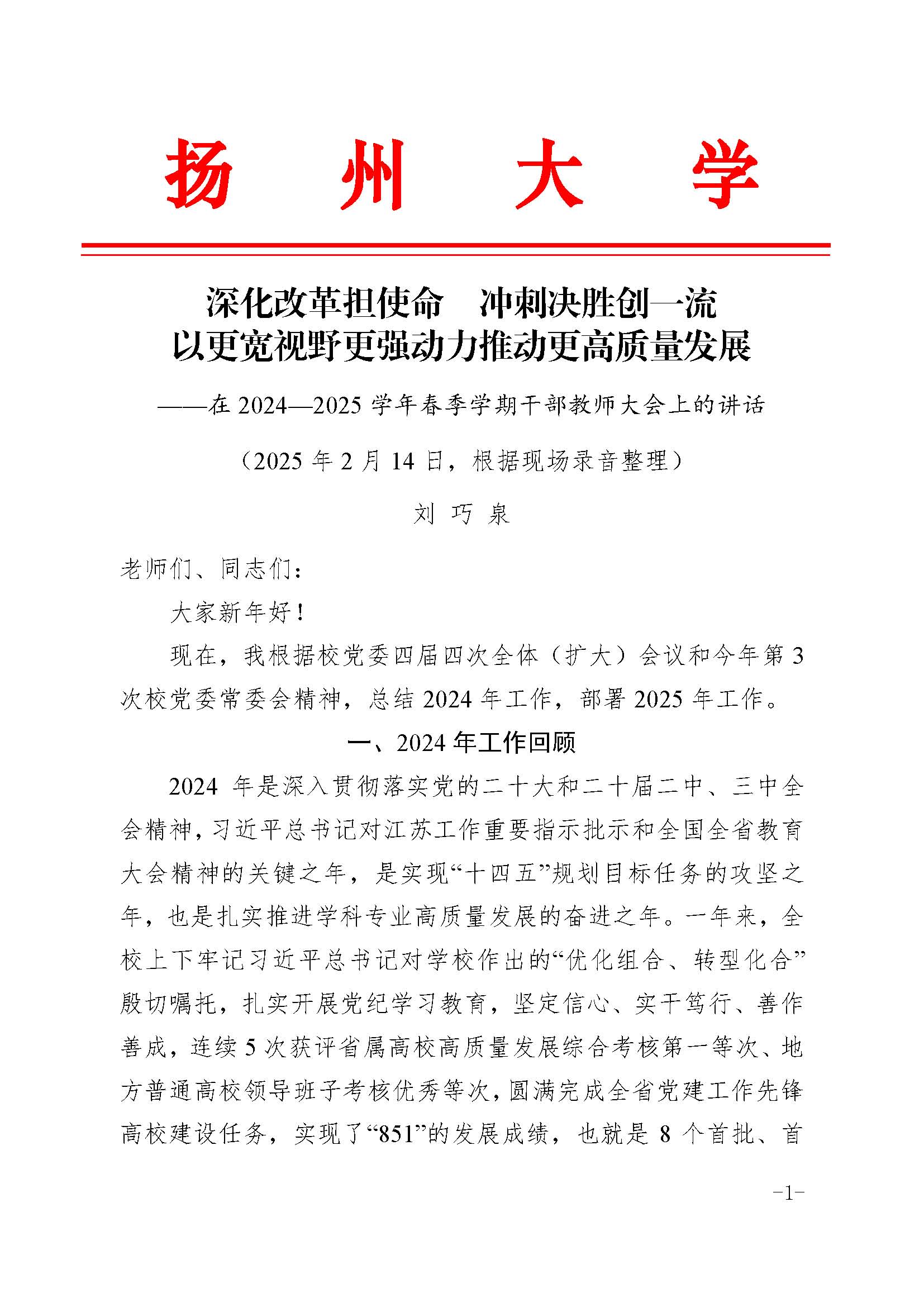 刘巧泉校长在2024—2025学年春季学期干部教师大会上的讲话